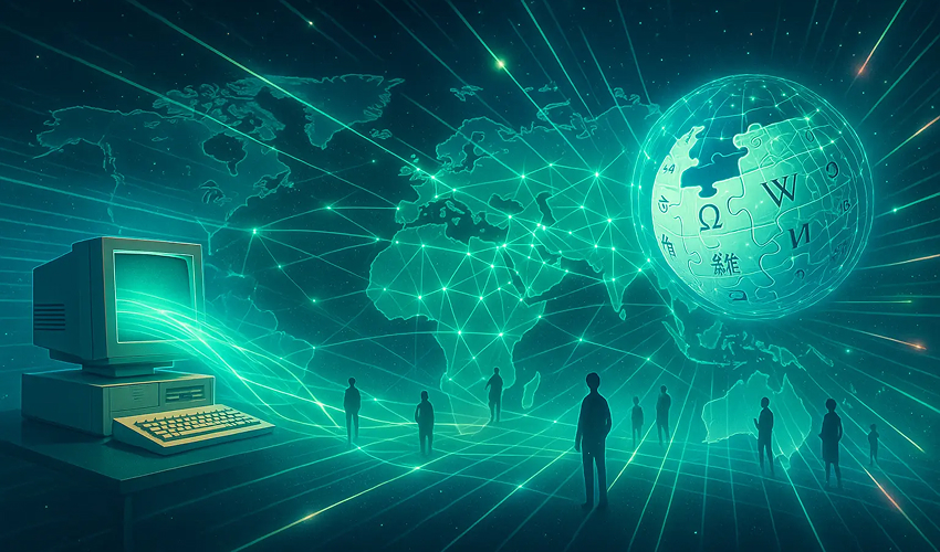 The personal computer reduces computation to a desk-sized companion. The internet dissolves geography. A student in Manila gains instant access to the same libraries as a professor in Oxford. A billion minds plug into a planetary nervous system. Wikipedia emerges, not a book, but a breathing organism of collective knowledge.