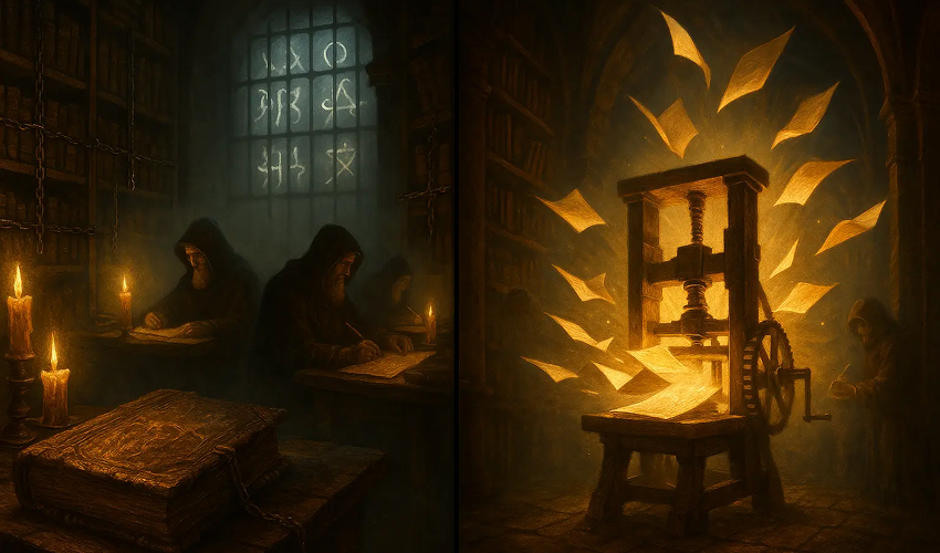 For most of human history, knowledge lived behind locked doors. Medieval Europe treated information the way ancient temples treated fire: sacred, dangerous, and limited to an initiated few. Books were rare creatures, hand-copied, fragile, bound in leather like tamed beasts. Monks spent decades transcribing a single text; a single mistake could ripple across generations of copies.