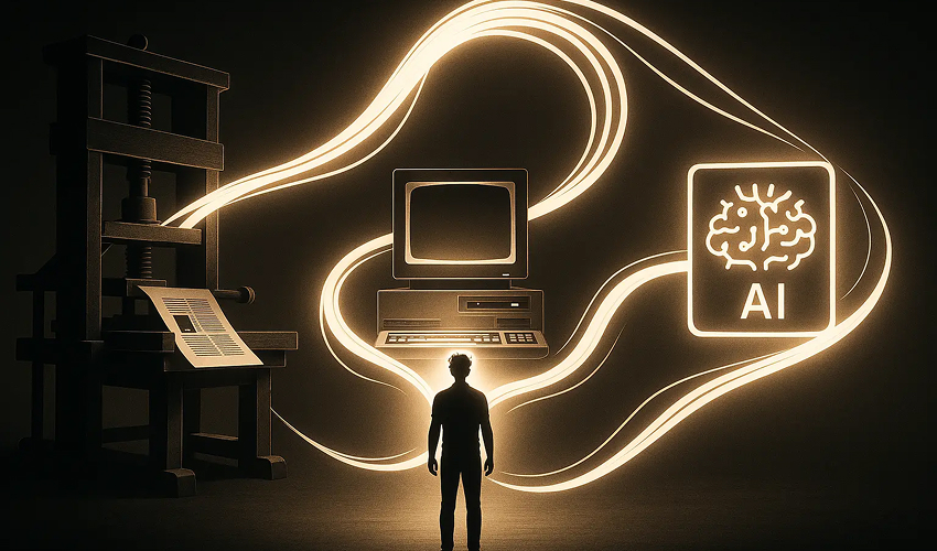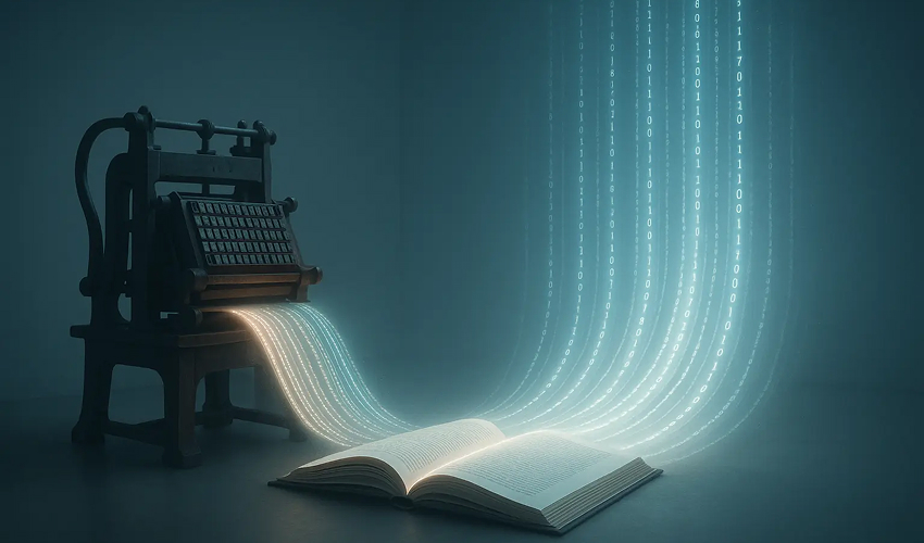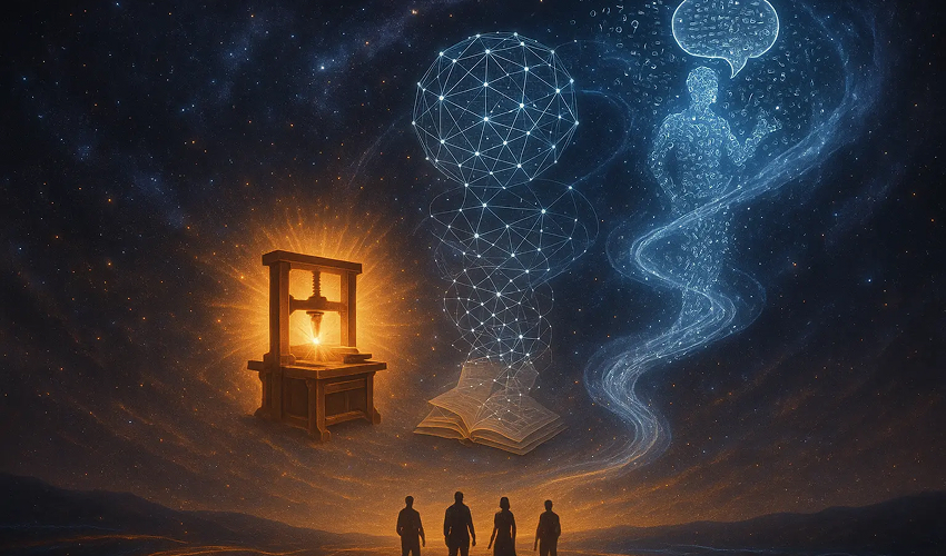 A neural network hums in a data center, rows of servers glowing like a mechanical monastery. In this place, language is not printed; it emerges. Meaning is not carved into lead; it flows through billions of parameters. And yet: the feeling is the same.
