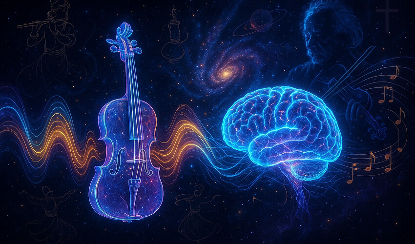 Across cultures, music is sacred from Krishna’s flute to Sufi whirls to biblical creation myths. Music bridges earth and heaven, matter and mind.