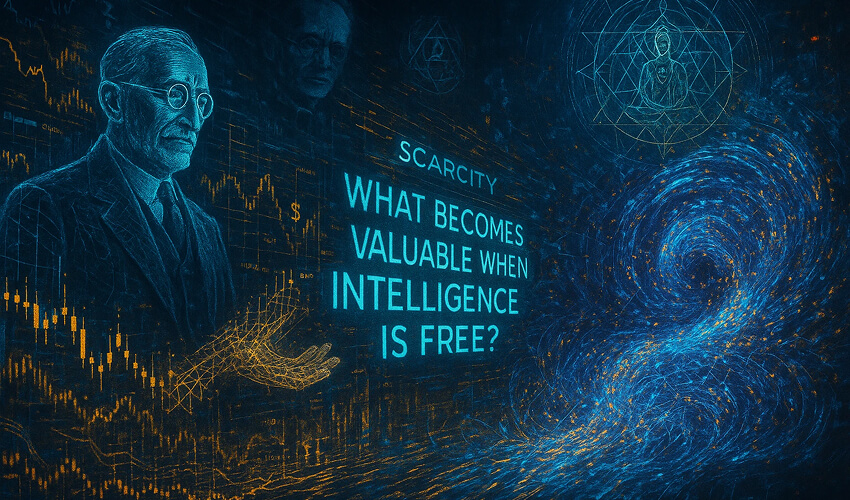 Scarcity mutates. The old rules of economics bend beneath the weight of infinite cognition. The question arises: when intelligence is free, what becomes valuable? (Mostaque, 2020s).